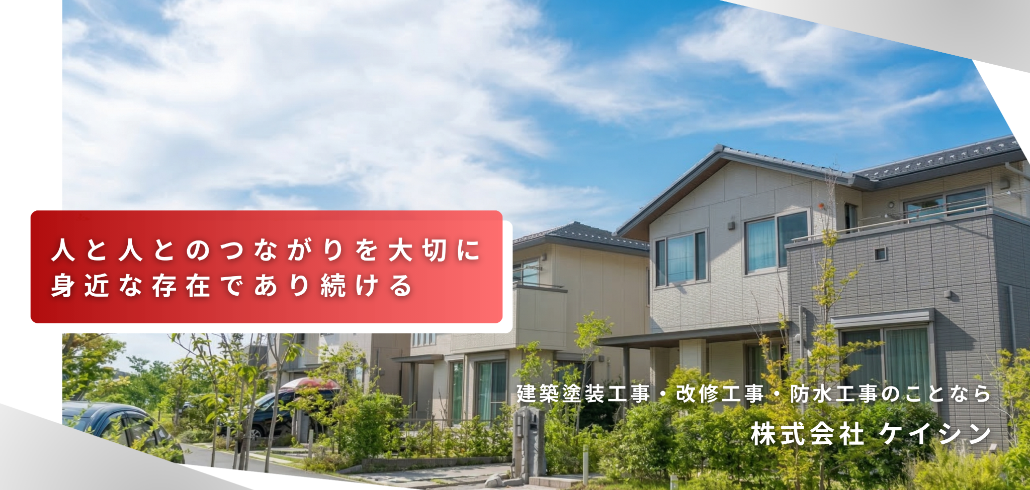 株式会社ケイシンは、夫婦で営む地域密着の会社として、建築塗装工事・改修工事・防水工事を中心に、建物の美観と耐久性を守る施工を行っております。